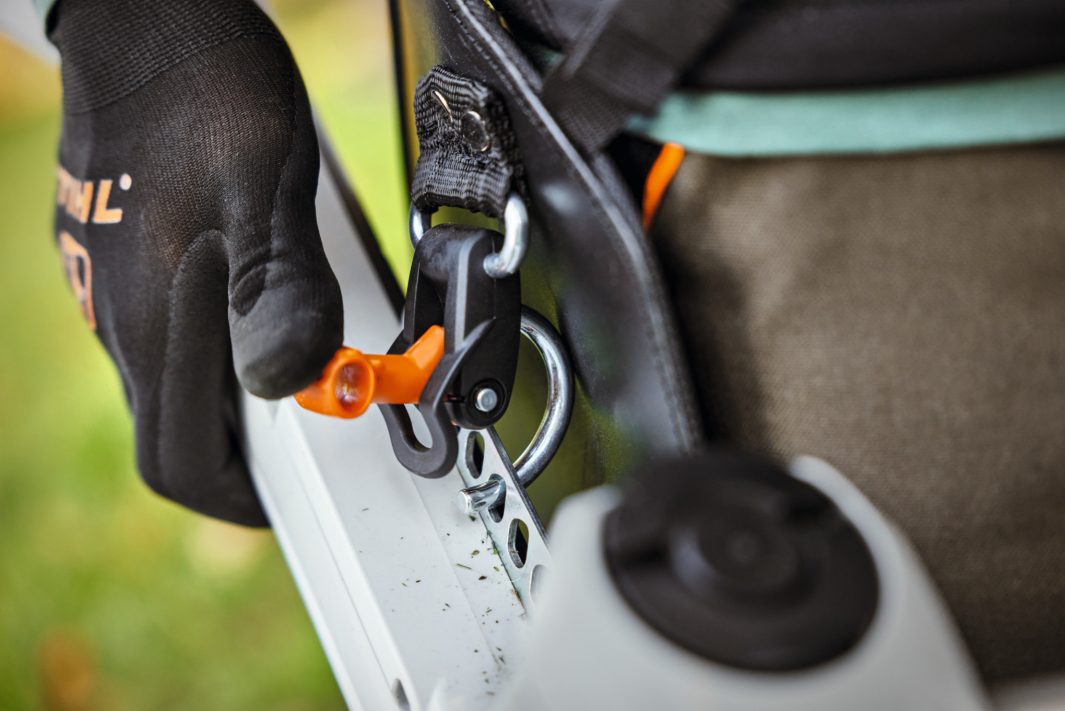 The right-hand cushion includes a support hook for briefly resting the tool, enabling quick transitions between working and repositioning. Meanwhile, the flexible back plate adjusts to movement, and the chest buckle lets you fine-tune the height to match your frame.