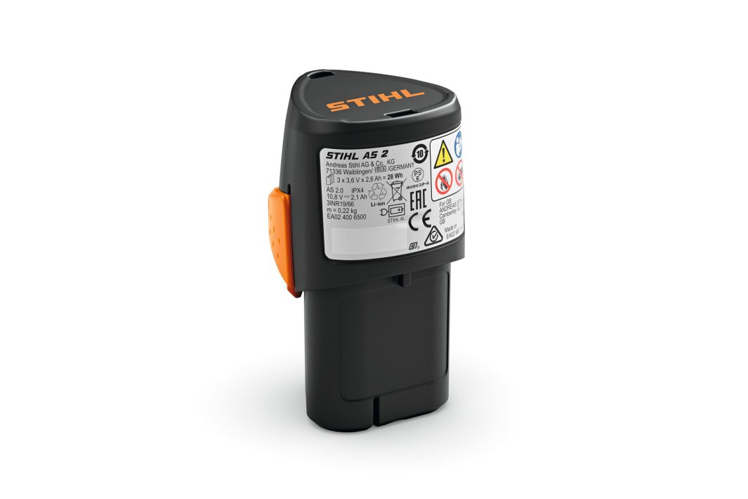 Stihl AS 2 Battery (10.8 V, 28 Wh, 0.22 kg) delivers constant power to AS System tools, features IPX4 protection, and recharges quickly with AL 1 or AL 5 chargers.