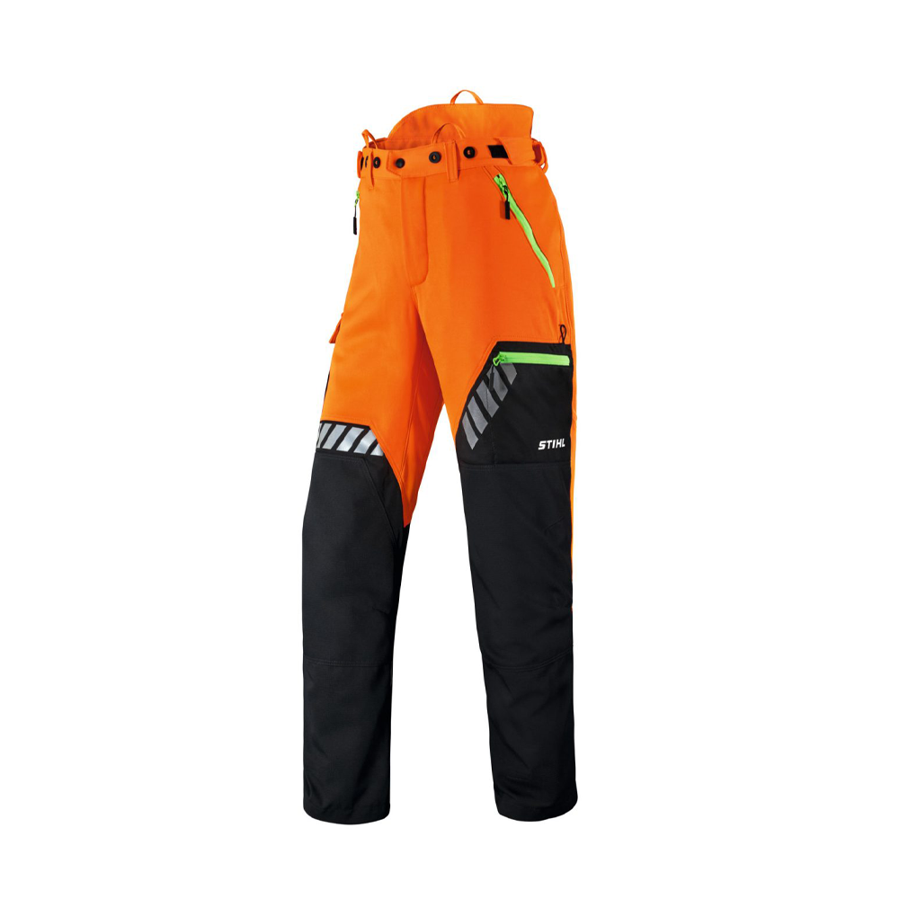 The trousers have reflective silver stripes, neon green accents pocket and high-visibility orange areas for excellent visibility in poor light conditions. You can attach STIHL braces to the DYNAMIC DuroTEC trousers thanks to the buttons and loops on the waistband. You can quickly and securely adjust the waist thanks to the Velcro adjustment. Two side pockets are easily accessible, and the trousers also have a back pocket, thigh pocket and a ruler pocket – meaning there is plenty of space for gloves and other accessories.