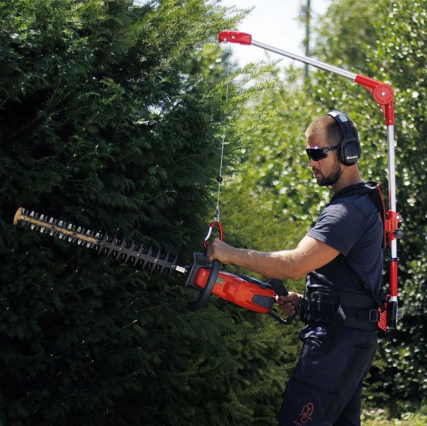 The harness is suitable for handheld equipment weighing between 4.5 kg and 8 kg, such as hedge trimmers, blowers, and pole tools. However, it is not intended for use with chainsaws. Tools connect quickly via a heavy-duty carabiner, while the steel cable runs smoothly in every direction thanks to durable nylon rollers.