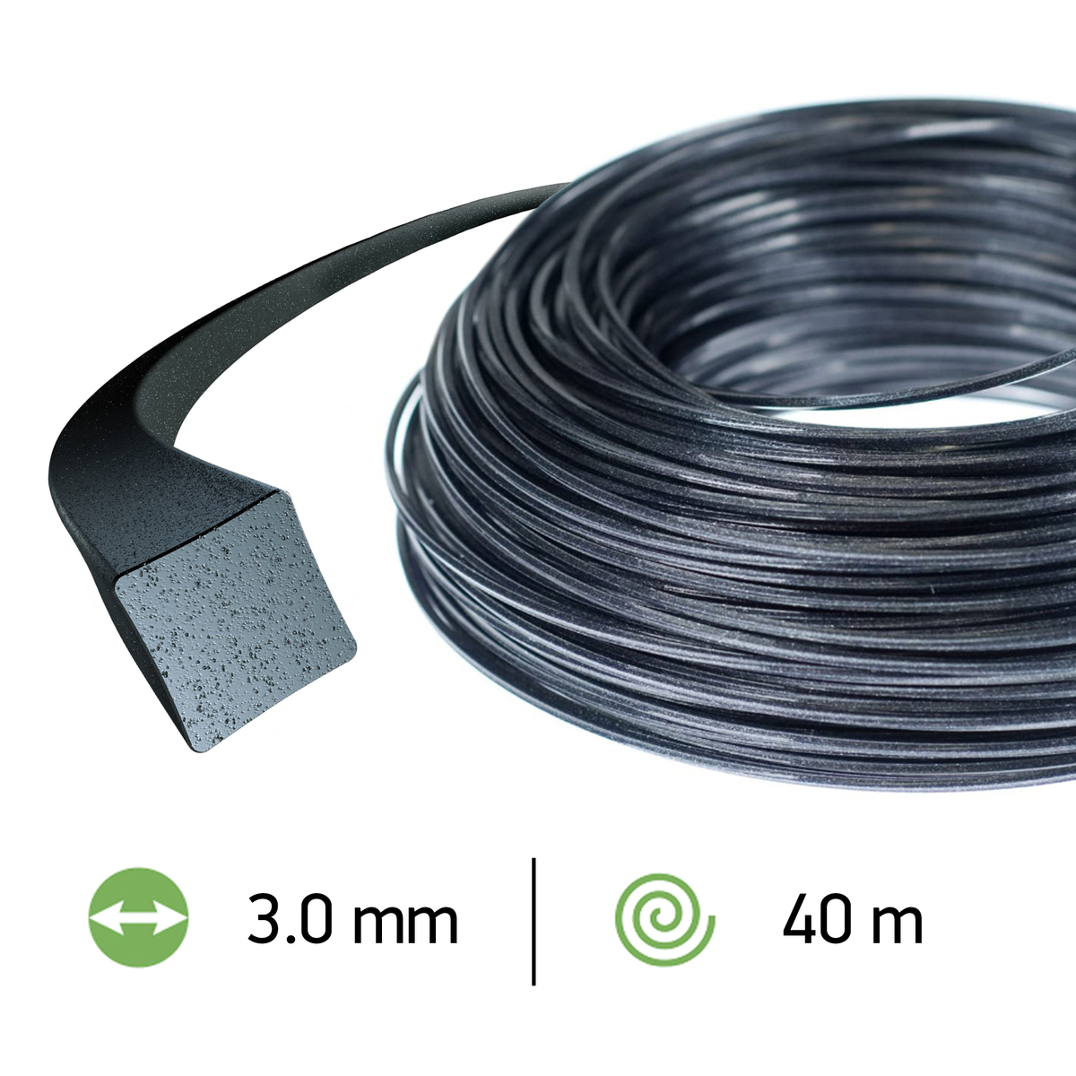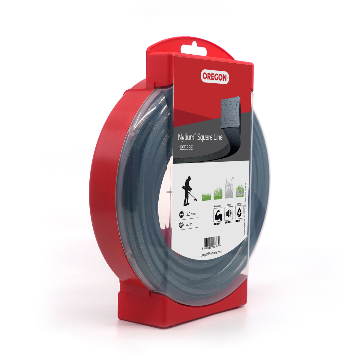 Oregon Nylium Square 3.0 mm Line, 40 m donut. Square profile with embedded aluminium resists welding and heat. Clean, powerful cutting for overgrown vegetation.
