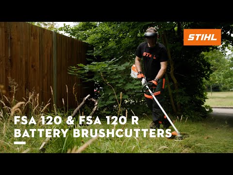 The STIHL FSA 120 is a battery-powered brushcutter featuring a brushless motor, variable-speed trigger, and ergonomic handle, perfect for efficient grass and weed trimming.